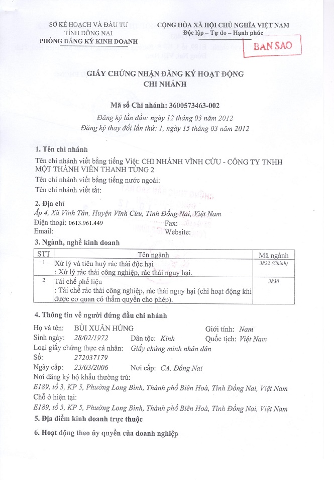 Certificate of Operation Registration of Vinh Cuu . Branch