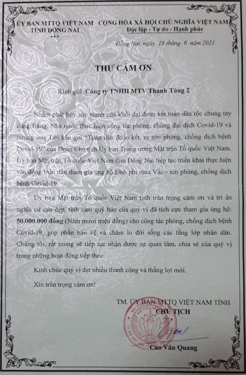 On 667, Thanh Tung 2 Company participated in supporting the fund for buying Covid-19 vaccines organized by the Standing Committee of the Vietnam Fatherland Front of the province.