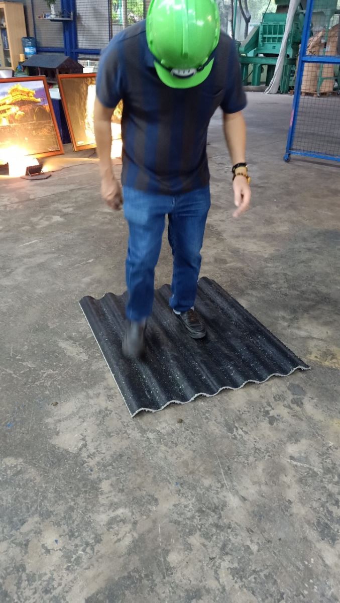 Ngói nhựa tái chế có kích thước: dài 1,2m x  rộng 0,9m x dày 10mm. Được tái chế từ các loại rác thải nhựa có giá trị thấp. Sản phẩm sau khi tái chế đã được thử nghiệm có độ bền cao, cách nhiệt tốt, chịu được thời tiết khắc nghiệt (mưa đá, nắng nóng ...)